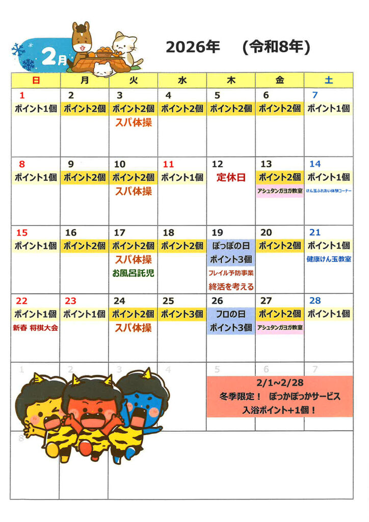 イベント2026.01.23今月のポイントカレンダー ポスト シェア はてブ 送る Pin it コピーしました リンクをコピー 2/1(日)~2/28(土)ぽっかぽっかぽっかっかキャンペーン 2月限定!毎日入浴ポイントが1ポイント多くプレゼント! 2月/1月ポイントカレンダー