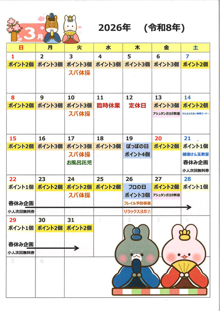イベント2026.02.23今月のポイントカレンダー ポスト シェア はてブ 送る Pin it コピーしました リンクをコピー 【~3/20金まで】ぽっかぽっかサービス 入浴ポイント+1個プレゼント 3月ポイントカレンダー