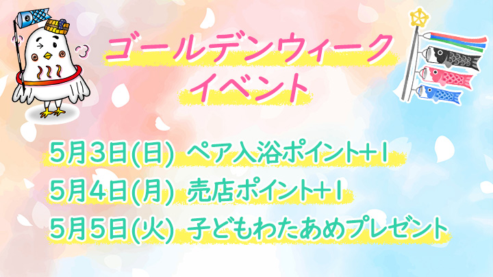 イベント2026.03.25ゴールデンウィークのイベント ポスト シェア はてブ 送る Pin it コピーしました リンクをコピー 3日(日) ペア入浴ポイント +1ポイント 4日(月) 売店ポイント +1ポイント 5日(火) 子どもワタあめプレゼント